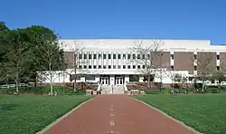 In 1891, prominent Philadelphia architect Frank Furness designed Recitation Hall.[23] Several buildings (Wolf, Sussex, and Harter Halls) were designed by Frank Miles Day, who also designed the formal campus landscape. From 1918 to 1952, Marian Cruger Coffin was appointed the university's landscape architect, a position which required her to unite the university's two separate campuses (the men's to the north and the women's to the south) into one cohesive design.[24] This was a challenge since the linear mall design of each was out of alignment with the other. Coffin solved this problem by linking them with a circle (now called Magnolia Circle) instead of curving the straight paths, which rendered the misalignment unnoticeable to the pedestrian.[25]