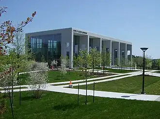 The campus expanded over the next two decades, constructing the G. Forbes Elliot Athletics Centre in 1975, the Canada Games Stadium in 1985, and the Thomas J. Condon Student Centre in 1986. Despite these developments, UNBSJ was considered a commuter campus until 1993, following the construction of the Sir James Dunn Residence. Additional buildings were constructed over subsequent years, such as the K.C. Irving Hall,[38] the Modern Languages Centre (now home to Dalhousie Medicine New Brunswick),[40] the Dr. Colin B. Mackay Residence,[41] and the Hans W. Klohn Commons.[42]
