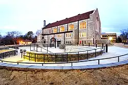 One of the main landmarks of the university is the Raymond Munger Memorial Chapel, erected in 1933. The chapel was built with one of the single largest donations ever received by the college at the time, a $75,000 gift from Miss Jesse Munger of Plainfield, N.J. Munger donated the money to build the chapel in memory of her father, Raymond Munger, a New York businessman who was known for his interest in religion and education. College students were paid to provide much of the labor for excavation, laying of the foundation and hauling of materials. Munger Chapel, which is listed in the National Register of Historic Places,[9] was designed by architect A.O. Clark of Rogers, Arkansas. Built of limestone trimmed with Nu-Carth stone, it is of Gothic design and follows general plans used in large cathedrals. The stained glass windows were designed and installed by The Willet Studios of Philadelphia. The university holds weekly services for the campus community in the chapel. It is also a popular wedding venue. The university celebrated the 75th anniversary of the chapel during a special ceremony during the 2008 Alumni Weekend.