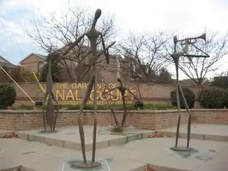 Further west is another of Spaulding's sculptures, Jammin' on the Avenue, which is installed at the entrance to historic Lockefield Gardens apartments, where the artist was born.[3] Lockefield Gardens was the city's first major public housing project, which was racially segregated at first, in the heart of Indianapolis's African American community. New construction and renovation of Lockefield Gardens' seven remaining historic buildings are home to IUPUI students, staff, faculty, and anyone wishing to live in this cultural area, known as the Indiana Avenue Cultural District.[3][7]