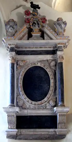 The ledger stone (across the middle of which now stands the 1926 wooden chancel screen) of James Courtenay (d.1592) "The Younger" survives in the Upcott Chapel, St Matthew's Church, the most ancient stone in the church,[26] inscribed in Gothic script as follows: