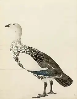 The upland goose was formally described in 1789 by the German naturalist Johann Friedrich Gmelin in his revised and expanded edition of Carl Linnaeus's Systema Naturae. He placed it with the other ducks, geese and swans in the genus Anas and coined the binomial name Anas picta.[5] Gmelin based his description on the "Painted goose" that had been included by the English ornithologist John Latham in his A General Synopsis of Birds. The species had been observed in 1775 on the Isla de los Estados (Staten Island) during Captain James Cook's second voyage to the Pacific Ocean.[6] The naturalist Joseph Banks had provided Latham with a water-colour drawing of the goose by Georg Forster who had accompanied James Cook. It is the holotype for the species and is held by the Natural History Museum in London.[7] The upland goose is now placed with four other species in the genus Chloephaga that was introduced in 1838 by the English naturalist Thomas Campbell Eyton.[8][9] The genus name comes from the Ancient Greek khloē meaning "grass" and -phagos meaning "-eating". The specific epithet picta is from Latin pictus meaning "painted.[10]