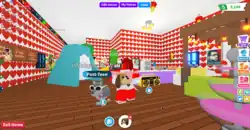 Adopt Me! revolves around adopting and caring for a variety of different types of pets, which hatch from eggs.[7] Specific eggs hatch different pets. A Starter Egg, which is given to a player when they begin to play for the first time, for example hatches only a dog or a cat. Some pets can only be purchased with Roblox's virtual currency, Robux.[8] Pets are grouped into five classes based on rarity and cost: common, uncommon, rare, ultra-rare, and legendary.[9] Once hatched, pets grow from their starting status as newborns, growing up into juniors, pre-teens, teens, post-teens, and eventually becoming full-grown.[10][9] If a player has four fully grown pets of the same type, they can combine them to form a "Neon" pet, and four fully grown neon pets can be combined into a "Mega-Neon" pet.[10] Purchases within the game are facilitated both by Robux, and through Adopt Me!'s virtual currency, simply called "Bucks". Bucks can be earned by fulfilling the needs of a pet, such as eating and drinking, among other methods.[11] Players can also adopt children and roleplay with other users.[12]