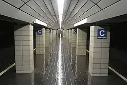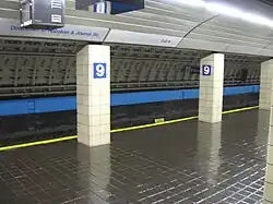 The first PATH stop in New York is at the Christopher Street station; service continues uptown to the 33rd Street terminal, making intermediate stops at Ninth Street, 14th Street, and 23rd Street.[5] Two stations formerly existed at 19th Street and 28th Street. The ornately designed stations in Manhattan featured straight platforms, each 370 feet (110 m) long and able to accommodate 8-car consists.[6] The stations underneath Sixth Avenue (14th, 19th, 23rd, and 28th streets, and the original 33rd Street Terminal) contain round columns with scrolls and the station name near the ceilings. The exposed steel rings of the tunnel's structure can be seen at Christopher and Ninth streets.[7]