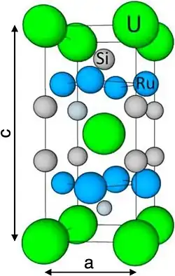 Uranium ruthenium silicide (URu2Si2) is a heavy fermion alloy composed of uranium, ruthenium, and silicon. URu2Si2 has the same '122' tetragonal crystal structure as many other compounds of present condensed matter research. URu2Si2 is a superconductor with a hastatic order (HO) phase below a temperature of 17.5 K.[1][2] Below this temperature, it is magnetic, and below about 1.5 K it superconducts.[3] However, the nature of the ordered phase below 17.5K is still under debate despite a wide variety of scenarios that have been proposed to explain this phase.