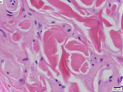 | Urbach–Wiethe disease in skin biopsy with H&E stain. | |