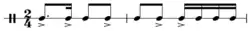 4 beat. The traditional instrumentation for a conjunto típico (traditional band), the usual performing group of folk merengue, is a diatonic accordion, a two–sided drum, called a tambora, held on the lap, and a güira. A güira is a percussion instrument that sounds like a maraca. It is a sheet of metal with small bumps on it (created with hammer and nail), shaped into a cylinder, and played with a stiff brush. The güira is brushed steadily on the downbeat with an "and-a" thrown in at certain points, or played in more complex patterns that generally mark the time. Caballito rhythm, or a quarter and two eighths, is also common. The double-headed drum is played on one side with a stick syncopation and on the other side with the palm of the hand.