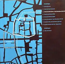 During medieval times Barcelona had a Jewish quarter, the Call, located between the current streets of Ferran, Banys Nous, Palla and Bisbe. Founded in 692, it survived until its destruction in 1391 in a xenophobic assault. It was separated from the rest of the city by a wall, and had two synagogues (Mayor, now a museum, and Menor, now the parish church of Sant Jaume), baths, schools and hospitals.[46]