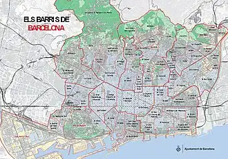 The last reform was carried out in 2006, this time aimed at establishing the neighborhoods that make up each district, with the objective of improving the distribution of facilities and proximity services.[30] Seventy-three neighborhoods were established, stipulated according to historical, cultural and social criteria, although the decision was not without controversy, mainly due to the fragmentation of some historical neighborhoods defended as units by the neighborhood associations: thus, for example, from the neighborhood of El Clot was segregated El Camp de l'Arpa; from Sants was segregated the neighborhood of Badal; Esquerra de l'Eixample was divided between La Nova and L'Antiga Esquerra de l'Eixample; and Poblenou was fragmented into five neighborhoods. Similarly, some neighborhood units were not satisfied with their aspirations to become neighborhoods, such as Can Caralleu, Penitents, Torre Melina or El Polvorí.