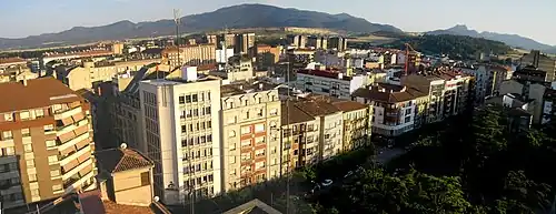 Miranda de Ebro extends its urban layout across a vast plain located between the Ebro River valley and the Bayas River. The city's main geographical constraints for development have been the river that gives it its name and La Picota Hill.[1] The original settlement was established at the foot of this hill and soon expanded across the river via a bridge. This led to the formation of the city's two most important districts: Aquende (on the right bank) and Allende (on the left bank). Since the plain was located on the left bank of the Ebro River, Allende became the more developed district.[2]
