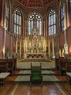 The English College, Douai was founded in 1568 but was forced to leave France in 1795 following the French Revolution. Part of the college settled temporarily at Crook Hall near Lanchester, northwest of Durham. In 1804 Bishop William Gibson began to build at Ushaw Moor, four miles west of Durham. These buildings, designed by James Taylor, were opened as St Cuthbert's College in 1808. There was a steady expansion during the nineteenth century with new buildings put up to cater for the expanding number of clerical and secular students. In 1847, the newly built chapel, designed by Augustus Welby Northmore Pugin was opened.[4] This was followed by the Big Library and Exhibition Hall designed by Joseph Hansom, 1849–1851.[5] The Junior House, designed by Peter Paul Pugin, was added in 1859. St Cuthbert's Chapel, designed by Dunn and Hansom, was opened in 1884, replacing AWN Pugin's 1847 chapel which the seminary had outgrown. The Refectory was designed and built by E. W. Pugin. The final development came in the early 1960s with the opening of a new East wing, providing additional classrooms and single bedrooms for 75 students. The main college buildings are Grade II listed, the College Chapel is Grade II* and the Chapel of St Michael is Grade I.