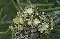 Usnea scabrida is a foliose lichen that grows from holdfasts on trees.[1][2] It occurs in southwest Western Australia.[3] It is a very pale grayish-yellowish green, slender, pendant, branching from the base, unequally branching, and shrubby.[3] The cortex contains usnic acid, and the medulla contains scabrosins.[4] The lichen was described as a new species in 1844 by English botanist Thomas Taylor.[5]