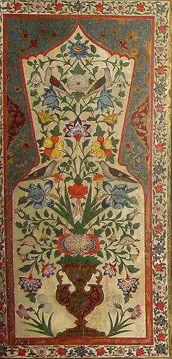 National traditions of wall painting, which is the most valuable legacy of Azerbaijani art, took the main place in the creativity of Usta Gambar Karabakhi. Chased decoration and richness of compositional and color resolutions can be seen in his delicate graphic painting of a complex plant ornament. The painter drew pictures of animals and fantastic beings upon branched ornaments of flowers and plants. The painting also didn't destroy the flatness of the wall, but on the contrary, underlined its constructive architectural details.[7]
