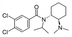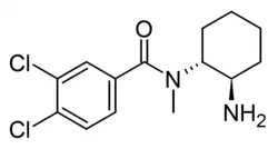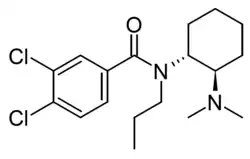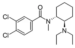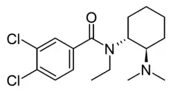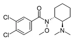 Utopioids (U-type opioids) are a class of synthetic opioid analgesic drugs first developed in the 1970s by the pharmaceutical company Upjohn.[1] However, they were never marketed for medical use. Some compounds from this class have been used for scientific research as model kappa opioid receptor agonists. In the mid-2010s, one mu opioid receptor selective compound from this class, U-47700, re-emerged as a designer drug and became widely sold around the world for several years before being banned in various jurisdictions from 2016 onwards. Following the prohibition of U-47700, a number of related compounds have continued to appear on illicit drug markets. They are often marketed online or included as components in mixtures sold under the guise of "street heroin." U-47700 itself is the most potent mu opioid agonist from this class, with around 7 to 10 times the potency of morphine. Some other compounds such as 3,4-MDO-U-47700 and N-Ethyl-U-47700 retain similar mu selectivity but with lower potency similar to that of morphine, while others have a mixture of mu- and kappa-mediated effects, such as U-48800. Most utopioid derivatives are, however, selective kappa agonists, which may have limited abuse potential as dissociative hallucinogens, but do not alleviate withdrawal distress in opioid dependent individuals or maintain addiction in a typical sense. Nevertheless, this has not stopped them from being sold as designer drugs, and a number of these compounds are now banned in many jurisdictions alongside U-47700 itself.[2][3][4][5][6][7][8][9]