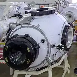 Prichal is a nodal module that has a pressurized spherical ball-shaped design with six hybrid docking ports. It also has functional components located outside and inside it. The interior of the module is divided into two zones: habitable and instrument with on-board systems. The zenith port out of the six ports is active SSVP-M to allow docking with the space station, while the four ports are passive hybrids of SSVP-M called SSPA-GB 1/2, enabling other modules to dock with the module.[1] Lastly, the nadir port is a passive SSVP-M; but has SSPA-GM adapter fitted on it converting it into SSVP-G. This would support the automated transfer of propellants between docked Russian spacecraft and the space station in both directions and the automated docking of crewed and uncrewed spacecraft using the KURS-NA system along with docking of future modules like Prichal to Nauka after removal of the adapter.[2] Such a design is significantly different from that of the docking modules Pirs and Poisk that have only one docking port for spacecraft each. The docking compartment has an internal volume of 19 m3 (670 cu ft).[1] It also has ERA grapple fixtures for the European Robotic Arm to move about from one part of the module to other parts or to Nauka.