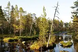 The Vätsäri Wilderness Area (Finnish: Vätsärin erämaa, Swedish: Vätsäri ödemarksområde) is located along the northeastern shore of Lake Inari in Inari, northern Finland, stretching all the way to the Finland–Norway border. The landscape is dominated by taiga forests of Scots pine, bog and bodies of water. The northeastern part rises as a treeless fell ridge. Vätsäri is one of twelve wilderness areas in Lapland and covers an area of 1,550 square kilometers (600 sq mi).[2] The wilderness has one marked trail and a few cabins. The reserve is under the management of Metsähallitus (Administration of Forests) and was established with the other wilderness reserves in 1991. It is part of Pasvik–Inari Trilateral Park along with Øvre Pasvik National Park and Øvre Pasvik Landscape Protection Area in Norway, and the joint Norwegian–Russian Pasvik Nature Reserve.