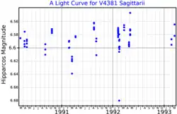 V4381 Sagittarii is a variable star in the constellation Sagittarius. A white supergiant of spectral type A2/A3Iab, it is an Alpha Cygni variable that varies between apparent photographic magnitudes 6.57 and 6.62. Its visual apparent magnitude is about 6.54.