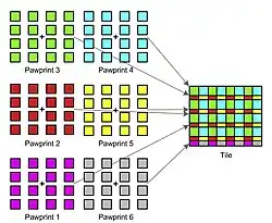 Over an area corresponding to 1.65° diameter on the sky, the image plane has 16 arrays of infrared detectors,[17] each array with 2048x2048 pixels of 20 μm size, corresponding on average to 0.34" on the sky.[19] The focal length of 12.1 m combines with the baffled aperture of 3.7 m to a focal ratio of 3.26. The arrays are separated by 90% of their width in one direction and by just under 50% their width in the other direction. A single exposure therefore corresponds to a patchy "paw print" on the sky. To fill the gaps and obtain a conventional image at least six shifted paw prints have to be combined into a "tile", which then is 1.5° by 1.0°. The image plane of the camera also has wave front detectors used to control the shape of the primary mirror and the position and tip/tilt of the secondary mirror (active optics). This compensates for flexure and ensures a focused image at all altitudes.[19]