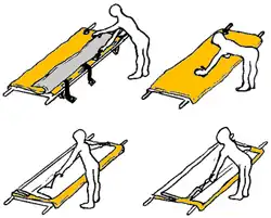 • lifting the casualty and pushing the stretcher under it. This method requires a minimum of five team members (four lifting and one pushing the stretcher) and should be used when a spine or a pelvis trauma are suspected;
