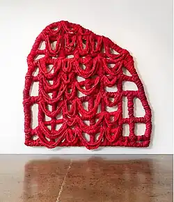 “The exhibition Cups and Grids brings the...work of Vadis Turner, a beacon in the Southern contemporary art firmament, to Geary in downtown New York. The presentation includes large-scale, mixed media wall sculptures made primarily of resin and cement, leather and cloth, and three-dimensional vessels comprised of charred wood, paint, and braided bedsheets. Turner’s pieces harken to the visceral and conceptual qualities of art made in the area in late the 1960s and early ‘70s. This was a time of deep interrogation and subversion of the anti-expressive nature of Minimalist pursuits—particularly the grid—and when materiality, as well as decorative and craft-based media, were being championed primarily by female artists.”[33]