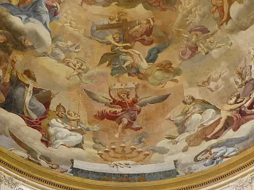 The dome of Val-de-Grâce was painted by Pierre Mignard and completed in 1666.[7] Mignard was a rival of another famous painter of the era, Charles Le Brun. The painting was commissioned by Anne of Austria in 1663 and was done in fresco, painted on wet plaster. Fresco was more difficult than painting with oils, as it did not allow for second thoughts. Val-de-Grâce’s fresco was the first of its size in Paris. Only smaller painted cupolas existed, one in Eglise des Carmes and the other in the chapel of the Sorbonne.[8] Some painting in oil pastel was later added to the fresco, but it faded soon after. Mignard’s painting was praised in "La Gloire du Val-de-Grâce", the only poem published by the playwright Molière, a friend of Mignard. The poem challenged the claims made in a poem by Charles Perrault about the genius of Mignard's rival, Le Brun.[9]