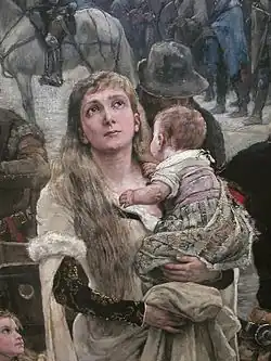 King Valdemar Atterdag sits to the right, on an elevated red throne in front of the large St. Catherine's church, and observes the town dwellers as they run to fill the vats. At the centre of the painting, the main characters are seen—i.e. the mayor and his family. The mayor clenches his fist in wrath and looks at the Danish king, while his wife looks up to the sky, towards God. The wife plays the role of Virgin Mary, and she has a tear drop in the corner of her eye.