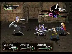 Valkyrie Profile has a unique turn-based battle system. The two sides wage battle during alternate turns, with the whole party sharing one turn and able to attack simultaneously during that turn. Each enemy is given their own turn and do not combine attacks with one another. Each of the party members is assigned to one of the buttons on the controller (Square, Triangle, Circle, or Cross). Pressing the corresponding button on the player's turn orders that character to attack. Fighters have three character-specific attacks each turn, though weapons can limit how many they can use. Mages cast their preset offensive spells, which builds up their CT (Charge Time). Charge Time replaces MP, decreases slowly on its own, and prevents casting spells when above 0. While a mage's CT decreases, they cannot perform any actions, though there are skills that allow exceptions to this.