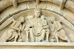 The main portal is located in the northern transept arm and faces the abbey square or Plaza Mayor. It features a semicircular arch and five archivolts supported by columns and capitals with foliate reliefs similar to the east gallery of the cloister and a tympanum sculpted with the Virgin and Child, surrounded by angels. Above it there is a cornice with a frieze of blind arcades with corbels sculpted with various motifs.