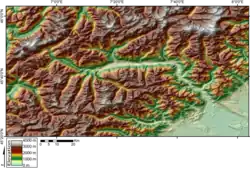 Elevation of the Valle d'Aosta. The lower elevation in the center of the image is the Dora Baltea river leading from Mont Blanc (on the left) down through the valley to Piedmont.