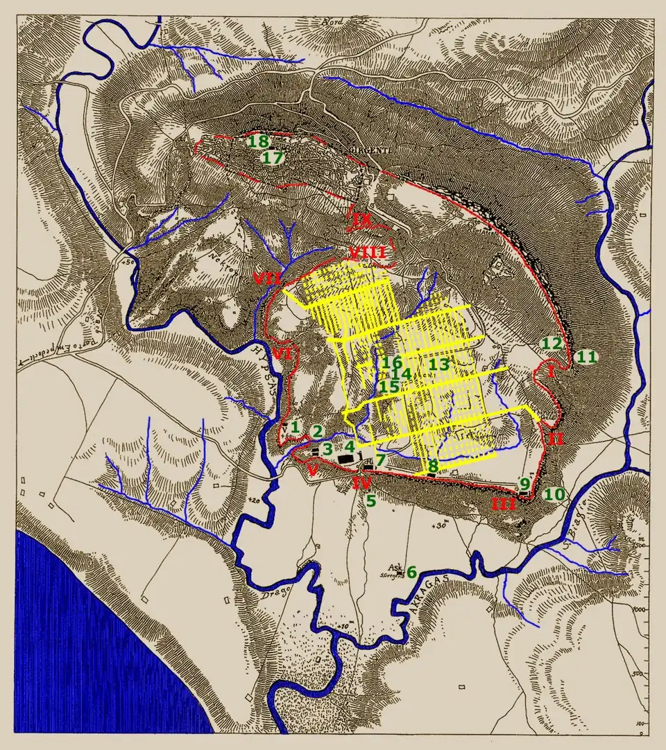 - Temple of "Hera", also built in the 5th century BC. It was burnt in 406 BC by the Carthaginians.