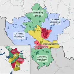 The newly formed Council of Deputies includes 25 persons, with 12 of them elected in twelve single-mandate constituencies, while 13 are elected in a single electoral district.[20] Among other things, the Council approves the local budget, manages state property, can establish and cancel local taxes and fees, assigns names to streets, and maintains the road network in the territory allocated to it.[21] It also has the right to create museums, higher educational institutions and create the necessary conditions for the national and cultural autonomies of the district.[22]