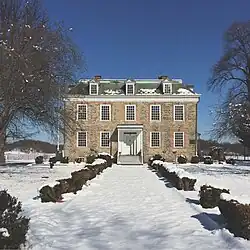 The house, designed by an unknown architect,[169] is built in the Georgian style and is 2+1⁄2 stories tall.[170][171] It was reportedly based on Philipse Manor in Westchester County.[60][99][172] The house has an L-shaped plan, with wings extending along the south and east sides.[157][170] The southern wing was probably completed first, followed by the eastern wing.[157] A lean-to was added to the house in the 19th century,[173] while a caretaker's apartment (adjacent to the main house) dates to before World War I.[157][128]
