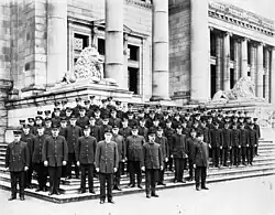 The Vancouver Volunteer Fire Brigade was established in 1886[2] with one volunteer hose-wagon company assigned to protect the new city which mainly had lumber mills at the time, and within 16 days of its existence, the city of Vancouver burned to the ground.[3] A week after the fire the city purchased its first fire engine from Ontario, the item arrived in August of that year, which made the volunteers confident that they could handle any situation that occurred. A second engine arrived in 1888 along with two new fire halls growing the strength from one company to three companies. J.H. Charlisle was appointed the city's first fire chief who began motorizing fire brigade, and the first motorized fire engine was purchased in 1908 from the Seagrave company of Columbus. By 1911, the department was ranked third best in the world, falling behind London and Leipzing Germany. By 1917 it was completely motorized (no more horse-drawn equipment) and was then recognized as the Vancouver Fire Department.[3][4] In 1929 the municipalities of South Vancouver and Point Grey amalgamated with the City of Vancouver which also meant the merger of the South Vancouver Fire Department and the Point Grey Fire Brigade, which added six new halls and increased the strength of the department by 100 men.