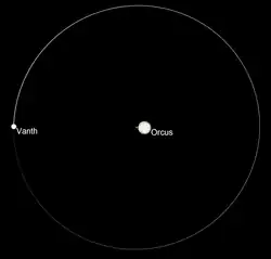Vanth forms a binary system with Orcus, in which the two bodies revolve around the barycenter between them. Orcus and Vanth are separated 9,000 km (5,600 mi) apart from each other's centers and revolve around their barycenter in nearly circular orbits with a period of 9.54 days.[6]: 67 [9] Vanth is less massive than Orcus, so it is the secondary component of the binary system and it orbits farther out from the barycenter at an orbital radius of 7,770 km (4,830 mi; 86.3% of the Orcus–Vanth separation distance). The more massive primary component, Orcus, orbits closer to the barycenter at an orbital radius of 1,230 km (760 mi; 13.7% of the separation distance).[f][9]: 4