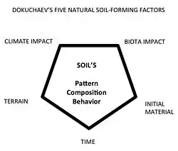 Dokuchaev considers the soil as a natural body having its own genesis and its own history of development, a body with complex and multiform processes taking place within it. The soil is considered as different from bedrock. The latter becomes soil under the influence of a series of soil-formation factors (climate, vegetation, parent material, relief and age). According to him, soil should be called the "daily" or outward horizons of rocks regardless of the type; they are changed naturally by the common effect of water, air and various kinds of living and dead organisms.[1]