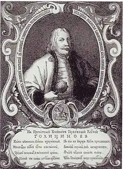 Prince Vasily Vasilyevich Golitsyn (Russian: Василий Васильевич Голицын, tr. Vasilij Vasil'evič Golicyn; 1643–1714) was a Russian aristocrat and statesman of the 17th century. He belonged to the Golitsyn as well as Romodanovsky Muscovite noble families. His main political opponent was his cousin Prince Boris Alexeyevich Golitsyn.