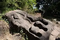 Other features of the area are a library, in poor condition, south of the sanctuary, and a relief of the Trimurti to the northwest. There are other carvings further north: a Buddha footprint on the cliff face and boulders shaped to resemble elephants and a crocodile. The crocodile stone has acquired some notoriety as being possibly the site of an annual human sacrifice described in a sixth-century Chinese text. The identification is lent some plausibility by the similarity of the crocodile's dimensions to those of a human.