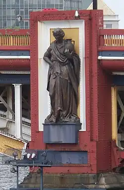 Frampton resigned from the project through pressure of work,[19] and Drury and Pomeroy carried out the project, each contributing four monumental statues, which were installed in late 1907. On the upstream piers are Pomeroy's Agriculture, Architecture, Engineering and Pottery, whilst on the downstream piers are Drury's Science, Fine Arts, Local Government and Education. Each statue weighs approximately two tons.[22] Despite their size, the statues are little-noticed by users of the bridge as they are not visible from the bridge itself, but only from the river banks or from passing shipping.[16]