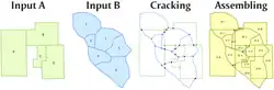 4. Assembling part A: Find each minimal closed ring of lines, and use it to create a polygon. Each of these will be a least common geographic unit (LCGU), with at most one "parent" polygon from each of the two inputs.