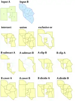 The goal of all overlay operations is to take in vector layers, and create a layer that integrates both the geometry and the attributes of the inputs.[10] Usually, both inputs are polygon layers, but lines and points are allowed in many operations, with simpler processing.