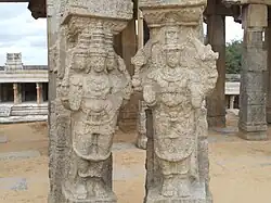 It is at the entrance to the sanctum sanctorum and has a profusion of sculptures and paintings over every inch of space on the columns and ceiling.[5] The images on the pillars and walls are of divine beings, saints, guardians, musicians, dancers and 14 avatars of Shiva. Figurines of the goddesses Ganga and Yamuna flank the entrance to the sanctum.[9] The exterior columns of this hall are built over a decorated plinth; the decorations are in the form of blocks of carved images of horses and soldiers. The columns are slim and have features of colonnettes carved with eaves, overhanging in a curved shape. The open space in the middle part of the hall is defined by large columns or piers which have carvings of triple figures.[4]