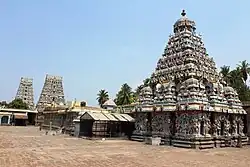 The Pallava king Mahendravarman I converted from Jainism to Saivism under the influence of Appar. He is believed to have destroyed a Jain monastery and built a temple called Gunavareswaram close to the temple. Mahendra Pallava is believed to have attained the name Gunavareswara on account of the incident.[6] A king called Kalinkaraya is believed to have endowed lot of treasures and built various structures in the temple as seen from the inscriptions in the temple.[2] King Raja Raja Chola I is believed to have stayed in this temple for a long time to study the architecture before building Brihadeeswarar Temple.[7] The temple is believed to have been expanded by later Pandyas. During the period of Thanjavur Marathas and British Colonization, the temple acted as a fort to the armies. The inscriptions indicate that the streets have to be cleaned before any temple procession with the likes of the streets in this village.[8]