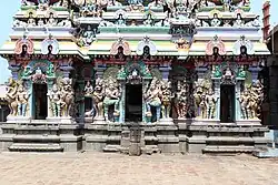 The sanctum is built on an elevated structure. There are shrines around the sanctum in the first precinct that has a shrine of Thilagavathiar and a pillared hall housing the sixty three Nayanar saints and the deities Shani (Saniswarar), Durga, Ganesha (Siddivinayagar), Kartikeya (Muruga), a set of Lingam, Nataraja and Surya. The shrine of Umayammai, the consort of the presiding deity, is present. The shrine houses the image of Lingam which is believed to have worshiped by Vishnu. There is a south facing shrine in the hall before the sanctum where the image of Tripurasamharamurthy with sixteen hands is housed. Sanctum houses the image of Veerataneswarar in the form of lingam. There is an image of Ammayapar housed in the sanctum. The shrine over the sanctum has a pyramidal roof with stucco images all through the filial at the top.[10]