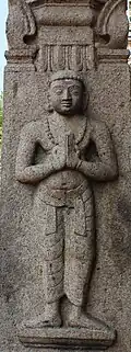 Appar's sister Thilakavathiyar settled here during her later years and devoted her lifetime service to Shiva. Afflicted by a painful illness, Thirunavukkarasar, who was originally called Dharmasenar and was then a staunch follower of Jainism, prayed for relief at this temple where his sister Thilagavathiyar served. By the divine grace of Shiva, he was cured. He embraced Saivism from then and started canonizing various temples with his verses.[14] The ruling Pallava king namely Kadava punished Thirunavukarasar in various ways and finally dropped him in a lime kiln. He was subsequently cast on the waters of sea, where he started floating and was pushed ashore in Thirupathipuliyur. It is believed that some of his best songs were sung at this time in praise of the presiding deities at Padaleeswarar temple and Veerateneeswarar temple. Thirunavukkarasar came back to Thiruvathigai from Thirupathripuliyur. Influenced by the greatness of the poet, the king himself converted to Shaivism from Hinduism.[15] Appar venerated Veerateeswarar in seventeen verses in Tevaram, compiled as the Fourth Tirumurai, Fifth Tirumurai and Sixth Tirumurai. The Soolai Kinaru, a well in the temple is believed to be the limestone well where Appar was dropped by the Jains. Though the actual location was in Cuddalore, the well is maintained as an indicative example of the event. The water from the well is taken by people suffering from stomach related ailments.[8]