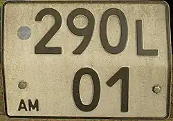 Vehicle registration plates of Armenia have black characters on a rectangular white background. They are composed of two or three numbers, two letters (smaller than the digits) in the middle, and two (or three) other numbers. At the left side is located the international code "AM" with an oval car plaque and, sometimes, the national flag. Starting from 6 August 2014 a new design of license plates was implemented.[1] The license plates have a national flag on the left side, a security hologram and a machinery readable Data Matrix Code.
