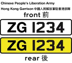 - "ZG" (for Zhù Gǎng 駐港 which means "stationed in Hong Kong") is for the People's Liberation Army in Hong Kong. ZG plates are not issued with the standard fonts seen on civilian plates. The font used is the same as that of Mainland Chinese plates. However, the plates are still black-on-white in the front and black-on-yellow in the rear.