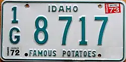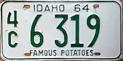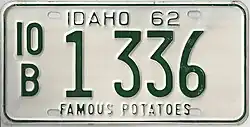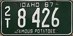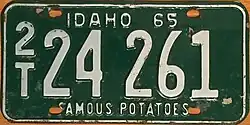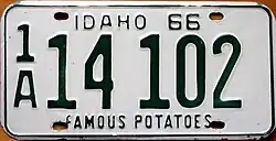 1968–70 | Embossed green serial on white plate with border line; "IDAHO 68" centered at top | "FAMOUS POTATOES" centered at bottom | A 12345 0/A 12345 1/A A1234 |