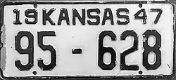 | 1947 | Embossed black serial on white plate with border line; "19 KANSAS 47" at top | none | 1-12345 10-12345 100-1234 |