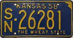 | 1958 | Embossed yellow serial on blue plate with state-shaped border; "KANSAS 58" centered at top | "THE WHEAT STATE" at bottom, offset to right | A/B-12345 | Coded by county of issuance (A/B) | ||