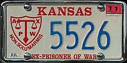 Ex-Prisoner of War | 1980–present | Embossed blue serial on white plate with American Ex-Prisoners of War shield and motto in red at left; "KANSAS" and "EX-PRISONER OF WAR" in red at top and bottom, respectively | 1234 | Must have been held as a prisoner of war while serving in the military, including any civilian who was held as a prisoner of war. |